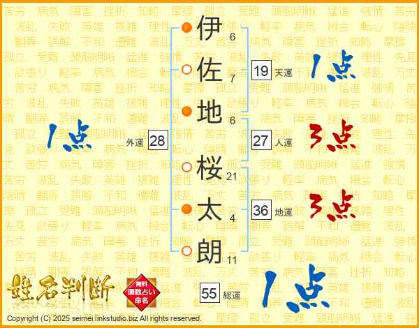 伊(6画)佐(7画)地(6画) 桜(21画)太(4画)朗(11画)
