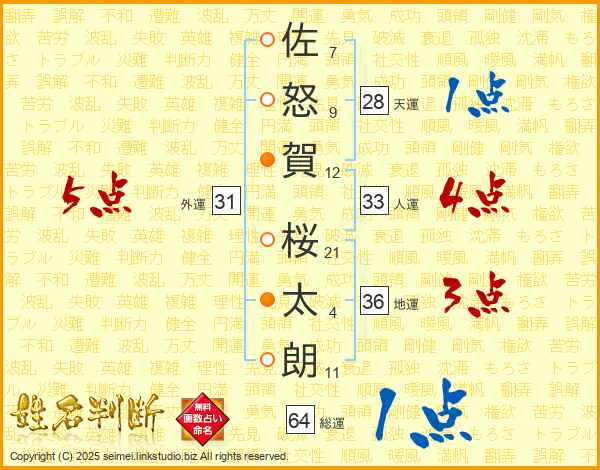 佐(7画)怒(9画)賀(12画) 桜(21画)太(4画)朗(11画)