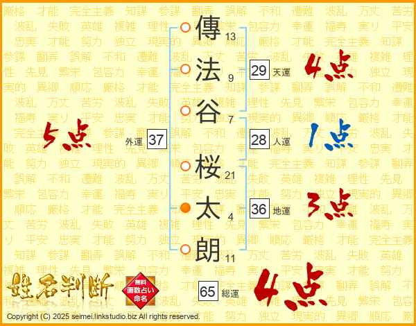 傳(13画)法(9画)谷(7画) 桜(21画)太(4画)朗(11画)