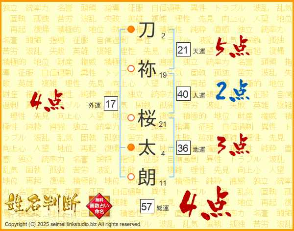刀(2画)祢(19画) 桜(21画)太(4画)朗(11画)