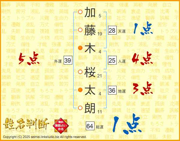 加(5画)藤(19画)木(4画) 桜(21画)太(4画)朗(11画)