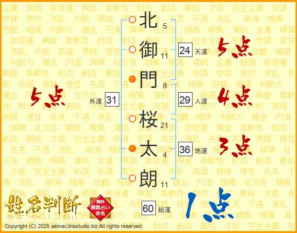 北(5画)御(11画)門(8画) 桜(21画)太(4画)朗(11画)