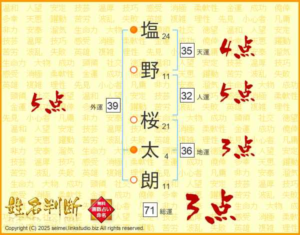 塩(24画)野(11画) 桜(21画)太(4画)朗(11画)