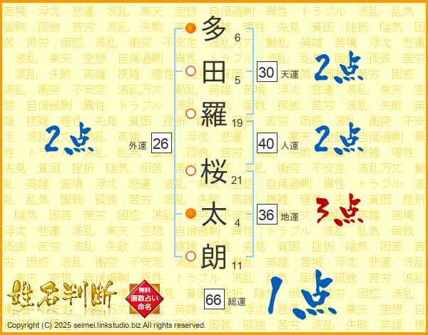 多(6画)田(5画)羅(19画) 桜(21画)太(4画)朗(11画)