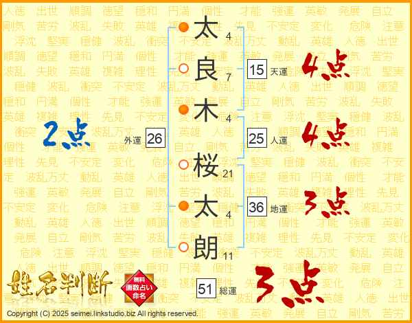 太(4画)良(7画)木(4画) 桜(21画)太(4画)朗(11画)
