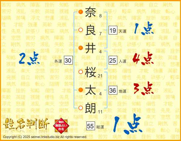 奈(8画)良(7画)井(4画) 桜(21画)太(4画)朗(11画)