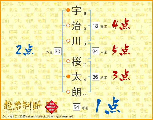 宇(6画)治(9画)川(3画) 桜(21画)太(4画)朗(11画)