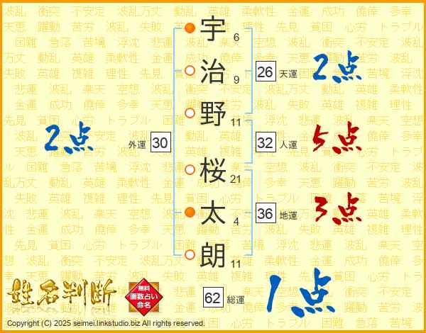 宇治野桜太朗さんの天運は26画の2点!