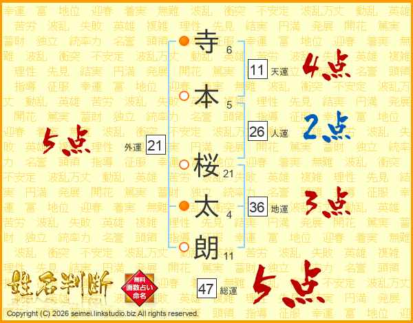寺(6画)本(5画) 桜(21画)太(4画)朗(11画)