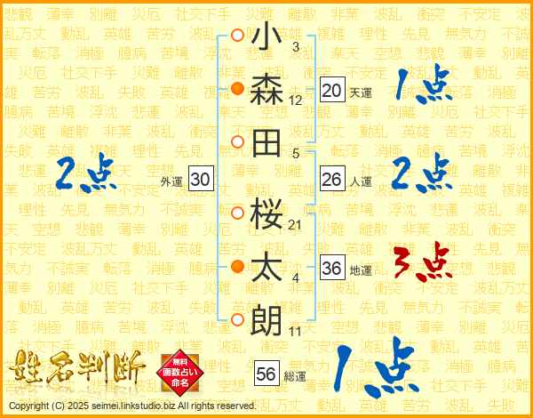 小(3画)森(12画)田(5画) 桜(21画)太(4画)朗(11画)