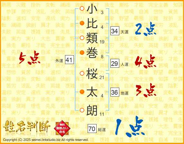 小(3画)比(4画)類(19画)巻(8画) 桜(21画)太(4画)朗(11画)