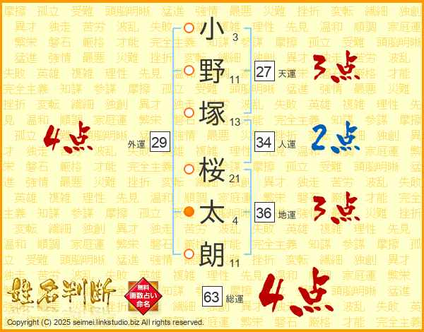 小(3画)野(11画)塚(13画) 桜(21画)太(4画)朗(11画)