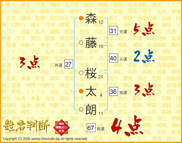森(12画)藤(19画) 桜(21画)太(4画)朗(11画)