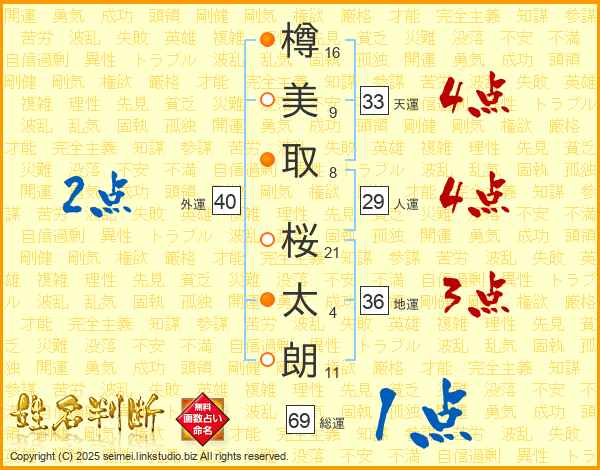 樽(16画)美(9画)取(8画) 桜(21画)太(4画)朗(11画)