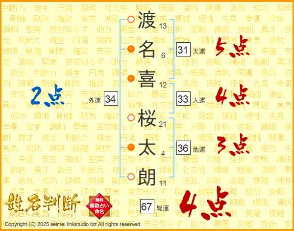 渡(13画)名(6画)喜(12画) 桜(21画)太(4画)朗(11画)