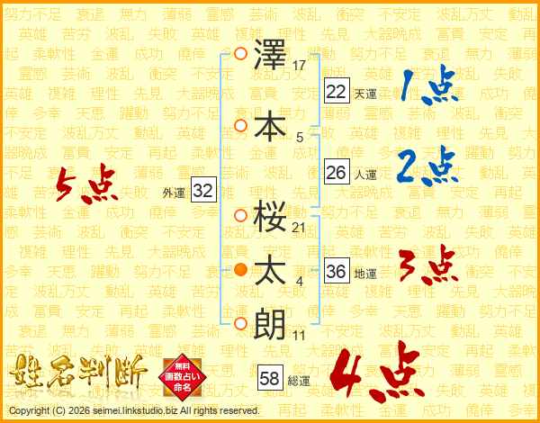 澤(17画)本(5画) 桜(21画)太(4画)朗(11画)