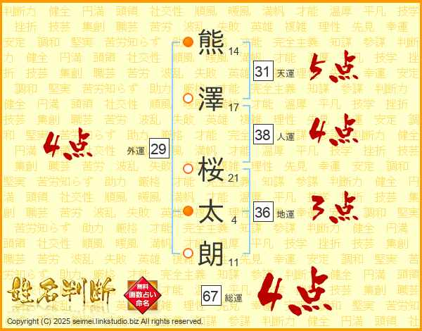 熊(14画)澤(17画) 桜(21画)太(4画)朗(11画)