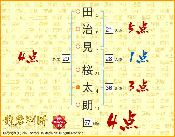 田(5画)治(9画)見(7画) 桜(21画)太(4画)朗(11画)