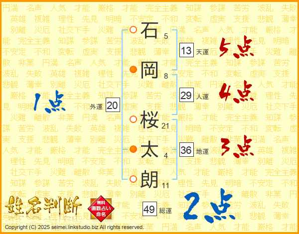 石(5画)岡(8画) 桜(21画)太(4画)朗(11画)