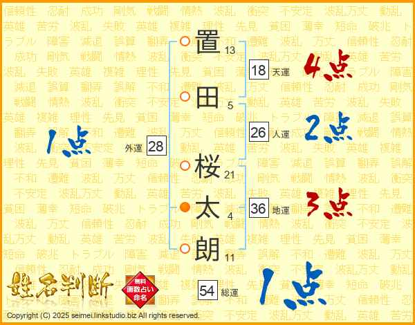 置(13画)田(5画) 桜(21画)太(4画)朗(11画)