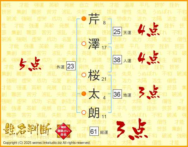 芹澤桜太朗さんの天運は25画の4点!