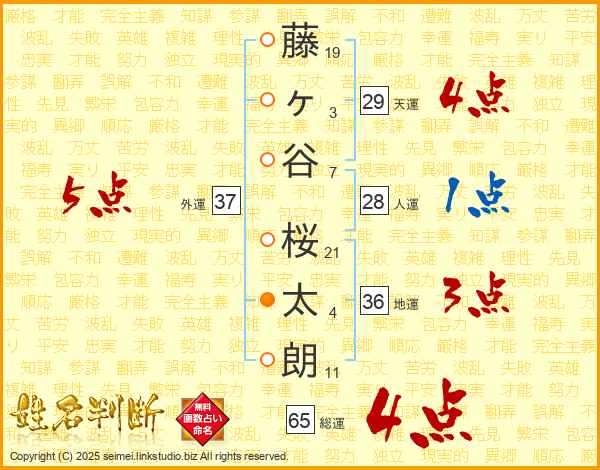 藤ヶ谷桜太朗さんの総運は65画の4点!