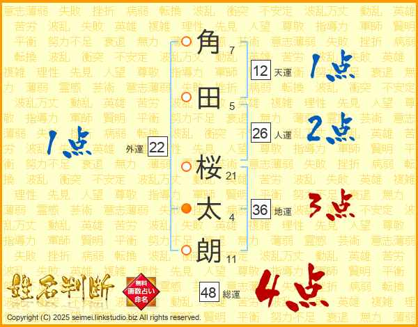 角(7画)田(5画) 桜(21画)太(4画)朗(11画)
