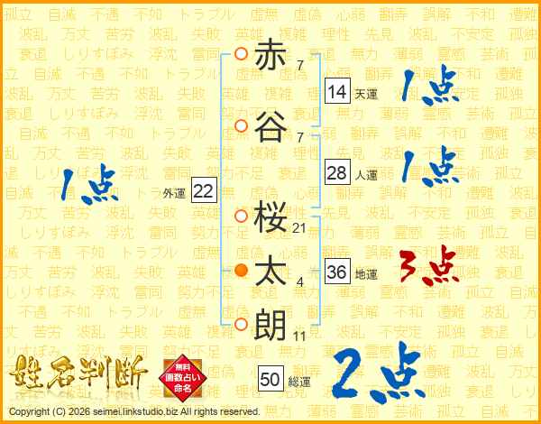 赤(7画)谷(7画) 桜(21画)太(4画)朗(11画)