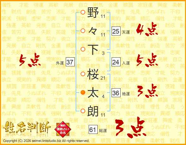野(11画)々(11画)下(3画) 桜(21画)太(4画)朗(11画)