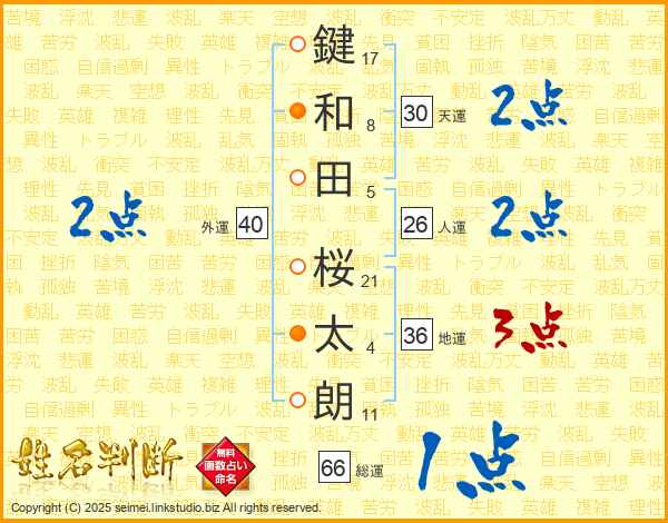 鍵(17画)和(8画)田(5画) 桜(21画)太(4画)朗(11画)