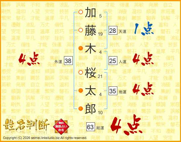加(5画)藤(19画)木(4画) 桜(21画)太(4画)郎(10画)