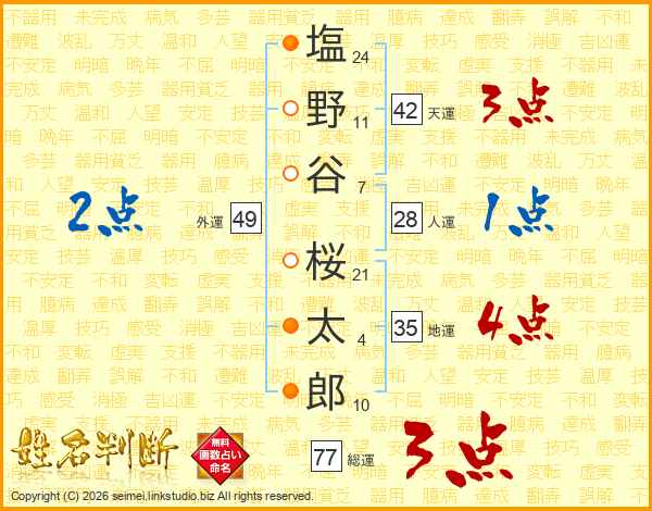 塩(24画)野(11画)谷(7画) 桜(21画)太(4画)郎(10画)