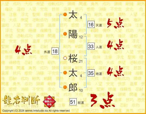 太(4画)陽(12画) 桜(21画)太(4画)郎(10画)