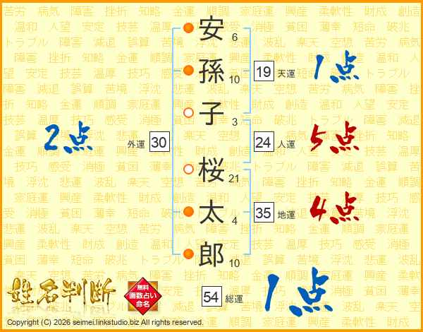 安(6画)孫(10画)子(3画) 桜(21画)太(4画)郎(10画)