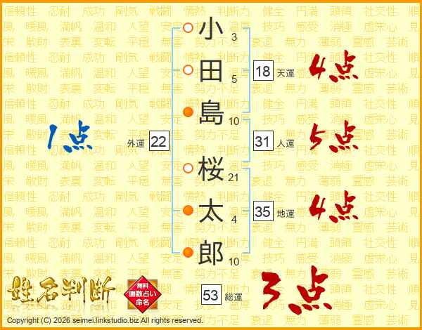 小(3画)田(5画)島(10画) 桜(21画)太(4画)郎(10画)