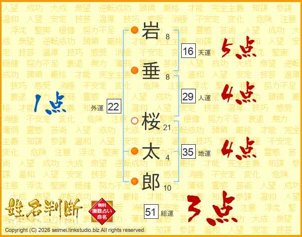 岩(8画)垂(8画) 桜(21画)太(4画)郎(10画)