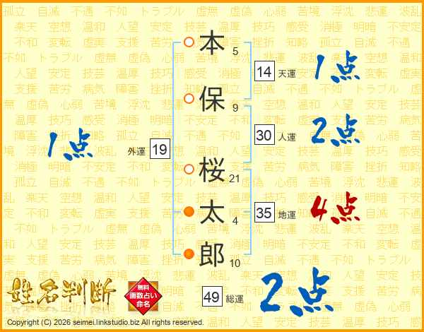 本(5画)保(9画) 桜(21画)太(4画)郎(10画)