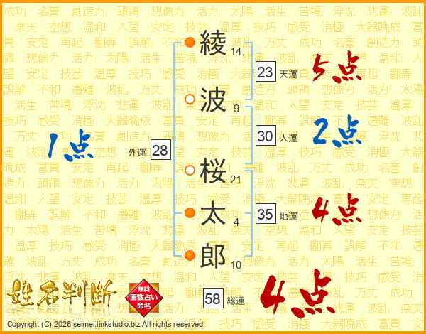 綾波桜太郎さんの総運は58画の4点!