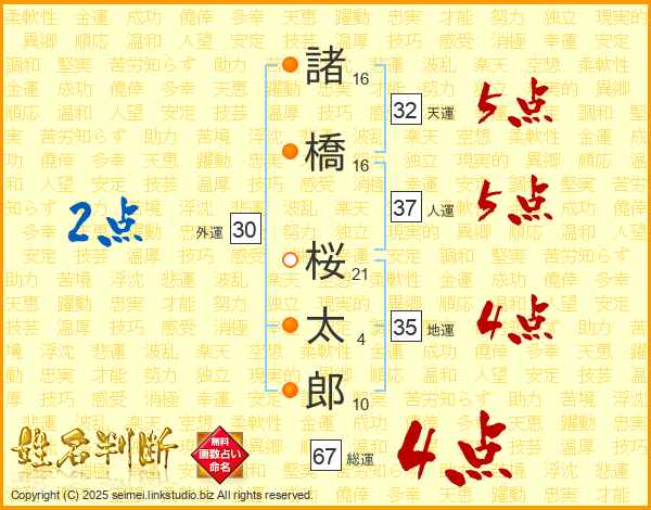 諸(16画)橋(16画) 桜(21画)太(4画)郎(10画)