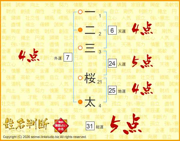 一二三桜太さんの総運は31画の5点!