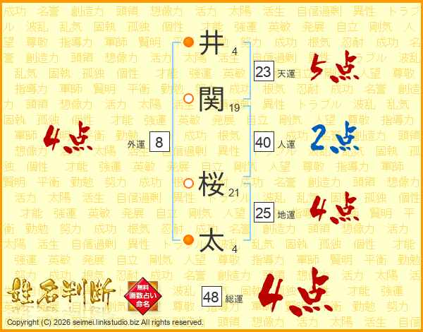 あなたの人生を表す1番重要な運勢です。生涯を通じて影響する総合運となり、主に50歳以降の晩年期に影響を及ぼします。苗字と名前の合計画数。