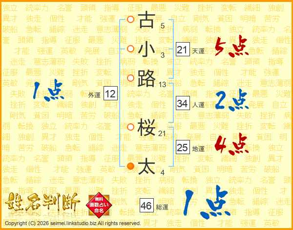古(5画)小(3画)路(13画) 桜(21画)太(4画)