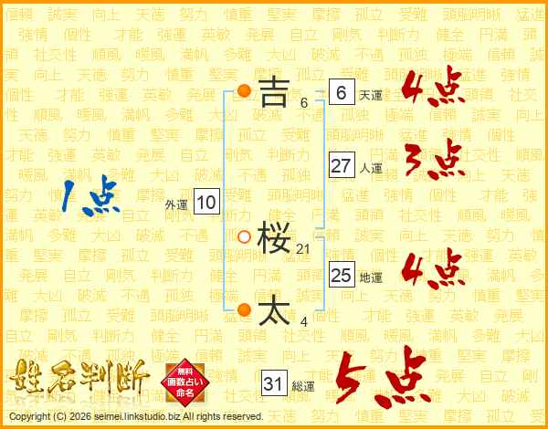 生活面を象徴する運勢です。外部から受ける影響力を表し、結婚運、家庭運や職場、環境への順応性を表します。総運から人運を引いた画数。姓や名が1文字の場合を除く。