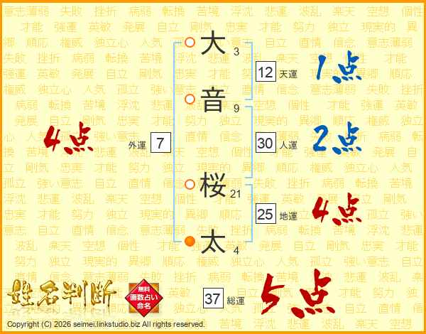 大音桜太さんの総運は37画の5点!