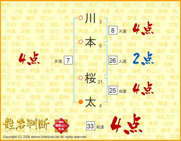 川本桜太さんの人運は26画の2点!