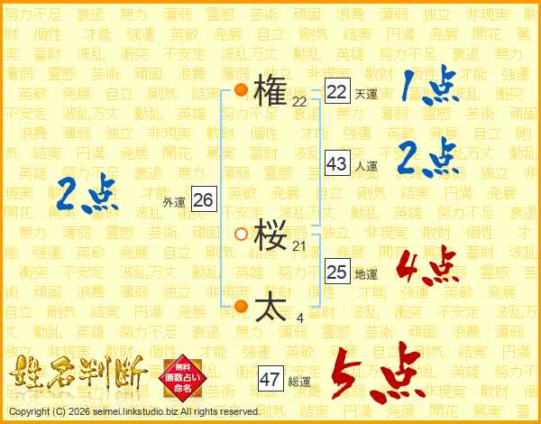 権(22画) 桜(21画)太(4画)