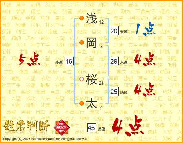 浅(12画)岡(8画) 桜(21画)太(4画)
