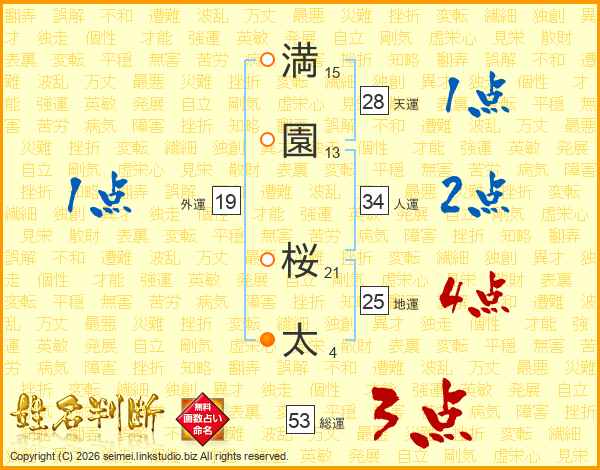 満(15画)園(13画) 桜(21画)太(4画)