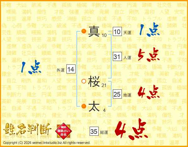 生活面を象徴する運勢です。外部から受ける影響力を表し、結婚運、家庭運や職場、環境への順応性を表します。総運から人運を引いた画数。姓や名が1文字の場合を除く。