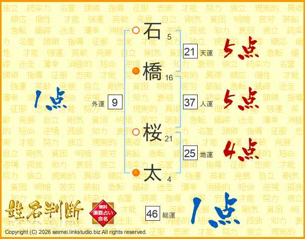 石橋桜太さんの人運は37画の5点!